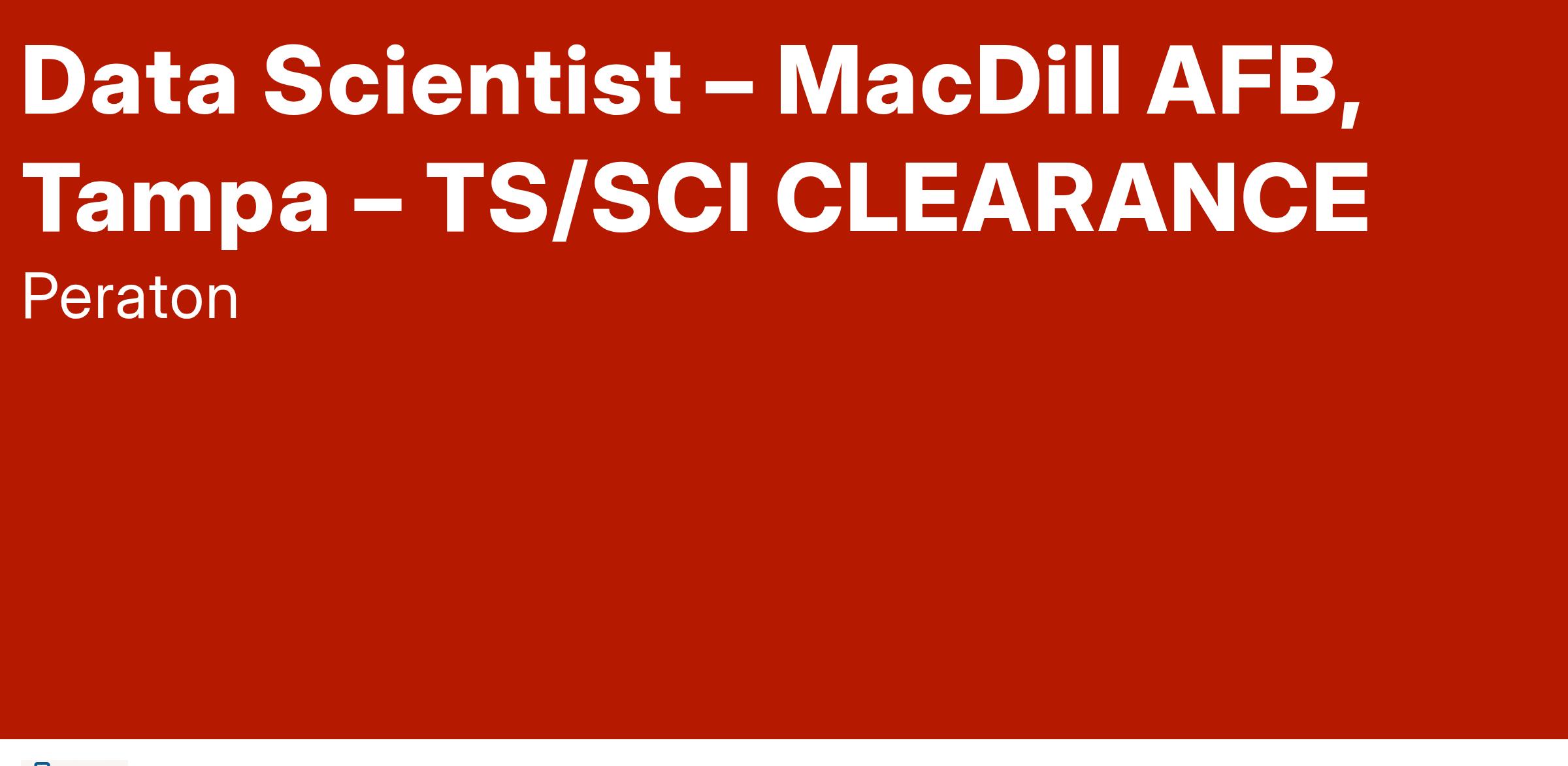 In support of the Operational, Planning, Implementation, and Assessment Services (OPIAS) contract, Peraton is seeking a Data Scientist/Data Analyst. This individual will be experienced in working with a diverse team of IO / MISO planners, social scientists, data engineers, intelligence analysts, and cultural advisors to translate empirical research findings into United States Government operational assessments and associated briefings on topics pertaining to the Middle East.
