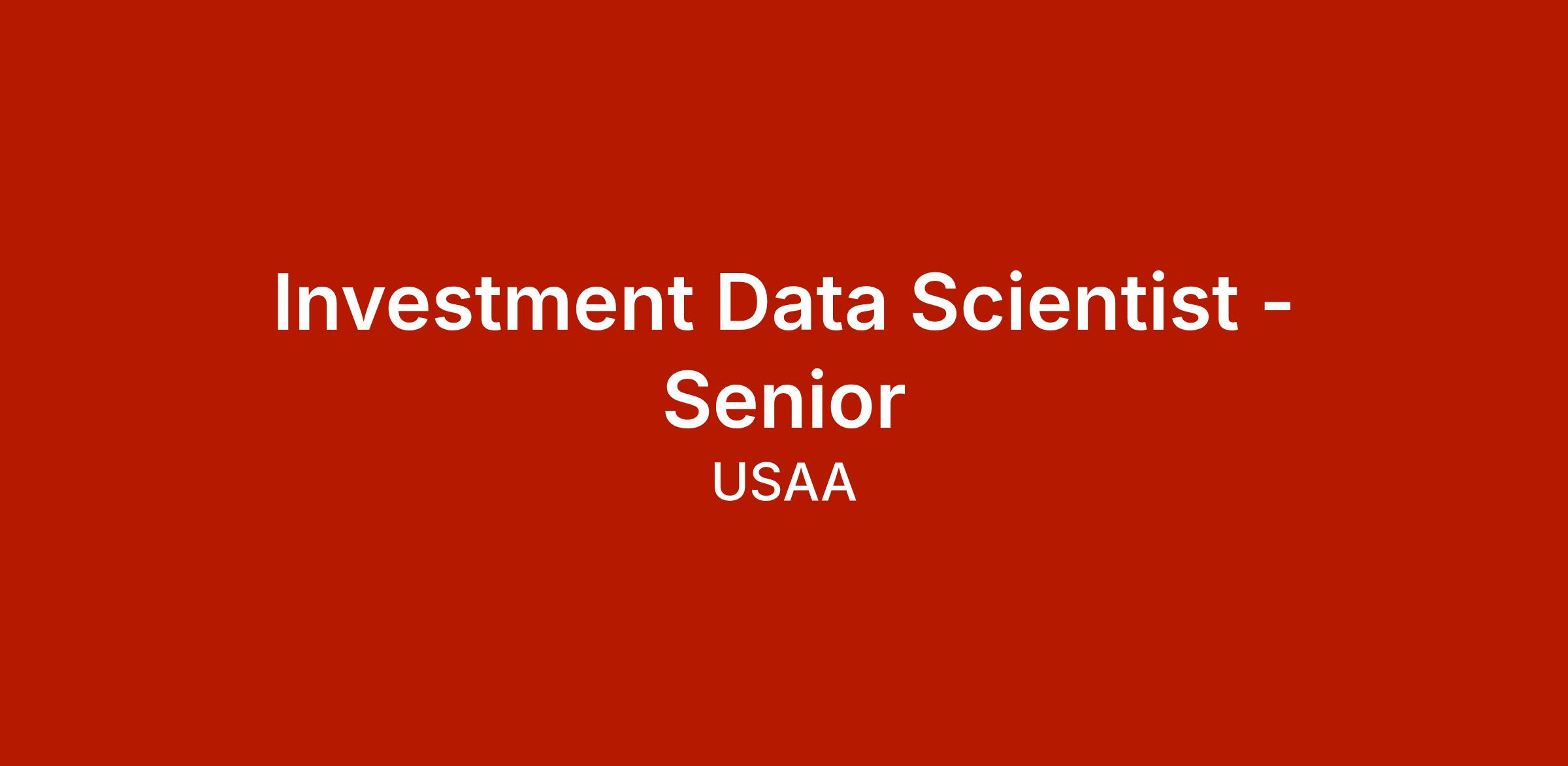 As a dedicated Investment Data Scientist - Senior, you will work with the Data Science Team in USAA’s Finance department. Their responsibilities will include working with investment risk models (Valuation, Performance Attribution, VaR, CECL), investment data management, external asset manager relations, and investment operational risk & processes. Additionally, they will support USAA’s Chief Investment Office with investment analysis.