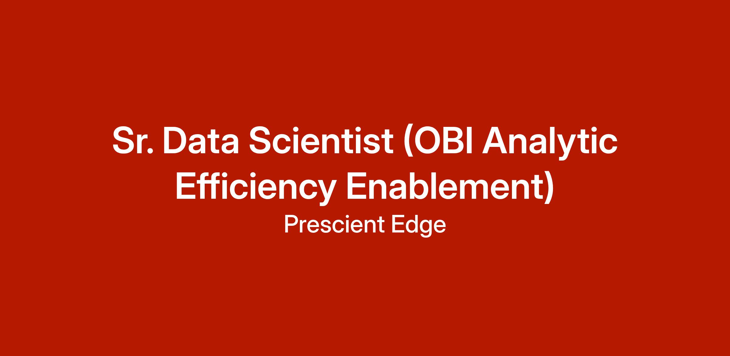 Prescient Edge is seeking a Sr. Data Scientist (OBI Analytic Efficiency Enablement) to support a Federal Government client.