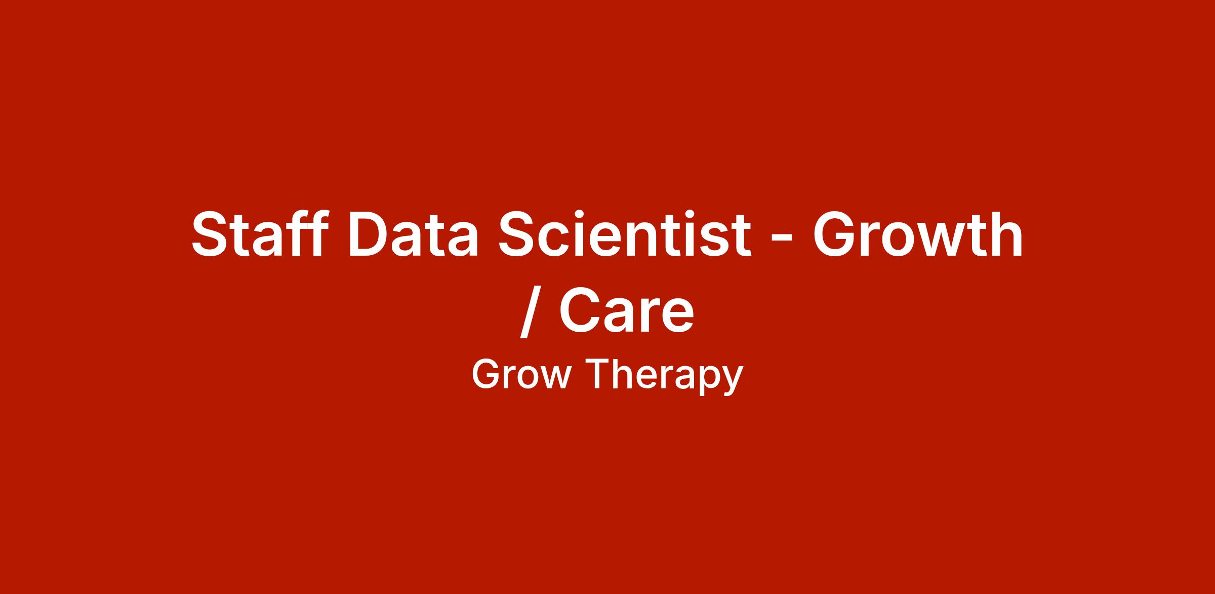 Grow Therapy is seeking a Staff Data Scientist to deepen our understanding of our users and unlock the next era of our growth trajectory. In this role, you will lead cross-functional, data-driven initiatives and drive insights that get more people successfully onboarded and retained in online therapy, shape how we build our mobile app and digital experiences, and lead the charge on how AI is used alongside therapy. You will also develop and own marketing and attribution models that help us reach patients more effectively and empower our providers’ success. Your work will shape product strategy, experimentation, and long-term investment decisions across the company.